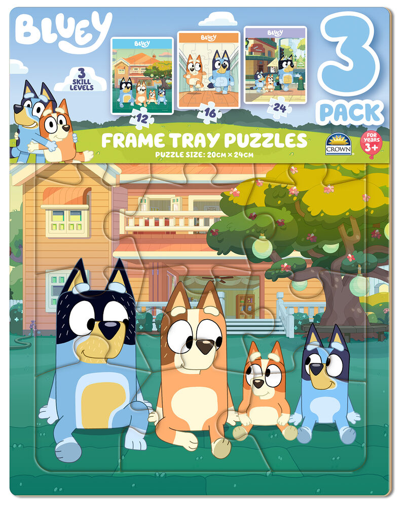 - Indulge your little Bluey enthusiast with this adorable 3 pack of Bluey Frame Tray Puzzles.