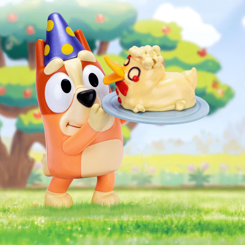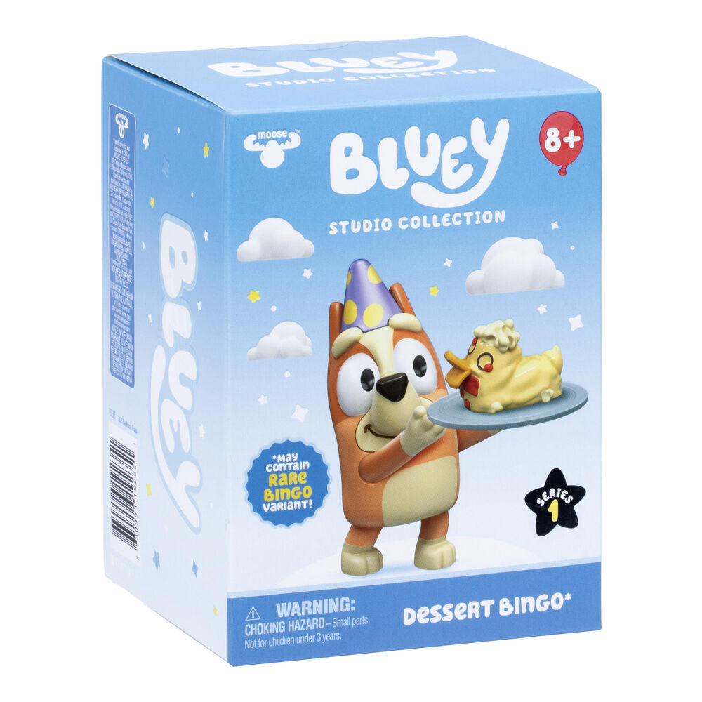 The Bluey Studio Collection celebrates the hit series with premium-quality figures, inspired by the show's most unforgettable moments. Taking inspiration from the "Duck Cake" episode, Dessert Bingo wears a polka dot birthday hat in a sleek metallic finish and holds Bandit's infamous duck cake. And for an extra treat, the Dessert Bingo pack might even be hiding a rare, chase variant!