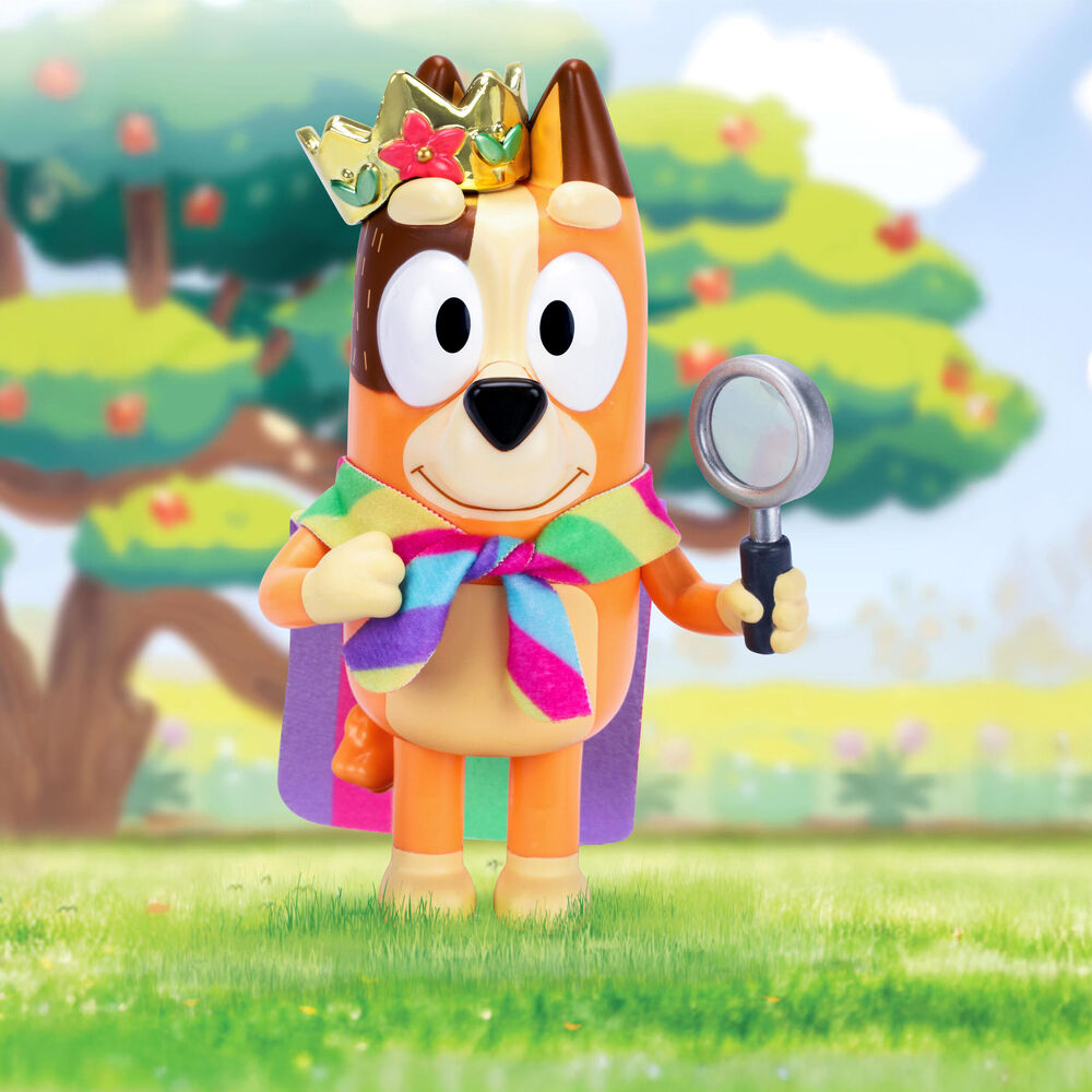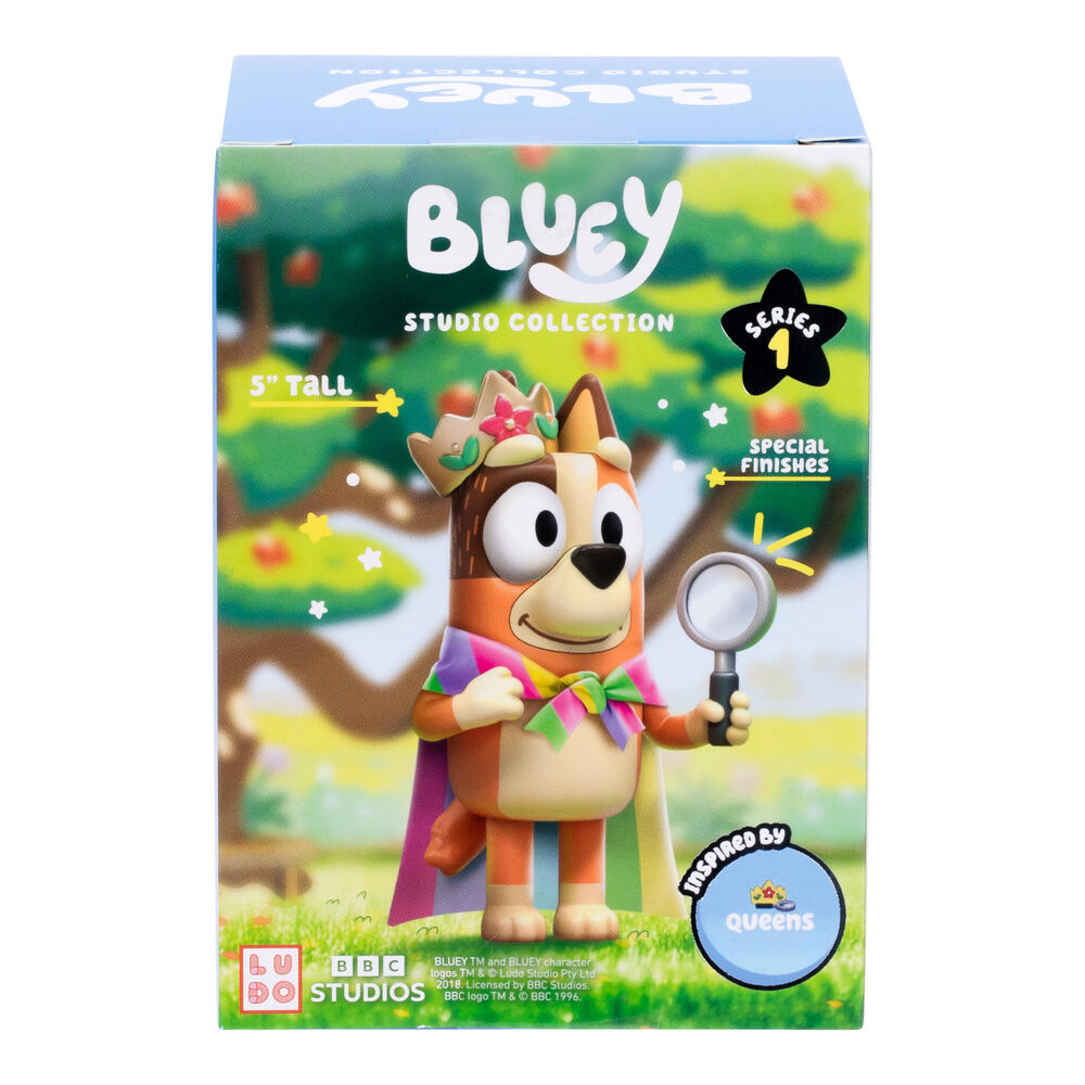 The Bluey Studio Collection celebrates the hit series with premium-quality figures, inspired by the show's most unforgettable moments. Bringing the majesty of the "Queens" episode to life, Queen Chilli features a vibrant fabric cape, plus a golden crown and magnifying glass in a stunning metallic finish.