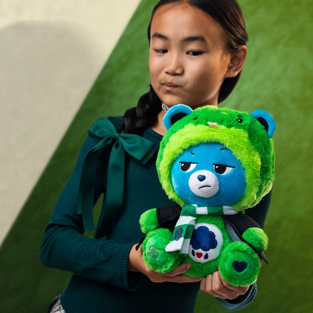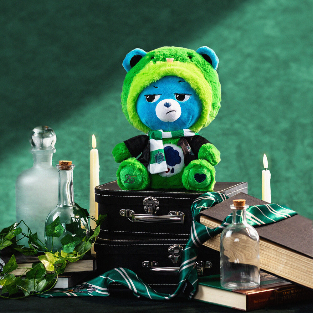 - Slytherin House Grumpy Bear 25cm plush has his storm cloud belly badge, House robe, House scarf with Crest, and a patterned serpent mascot hoodie! His paw also features the Harry Potter 25th Anniversary logo.