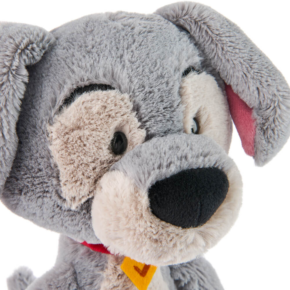 - Features his grey fur, short, floppy ears, expressive black eyebrows, and red collar.