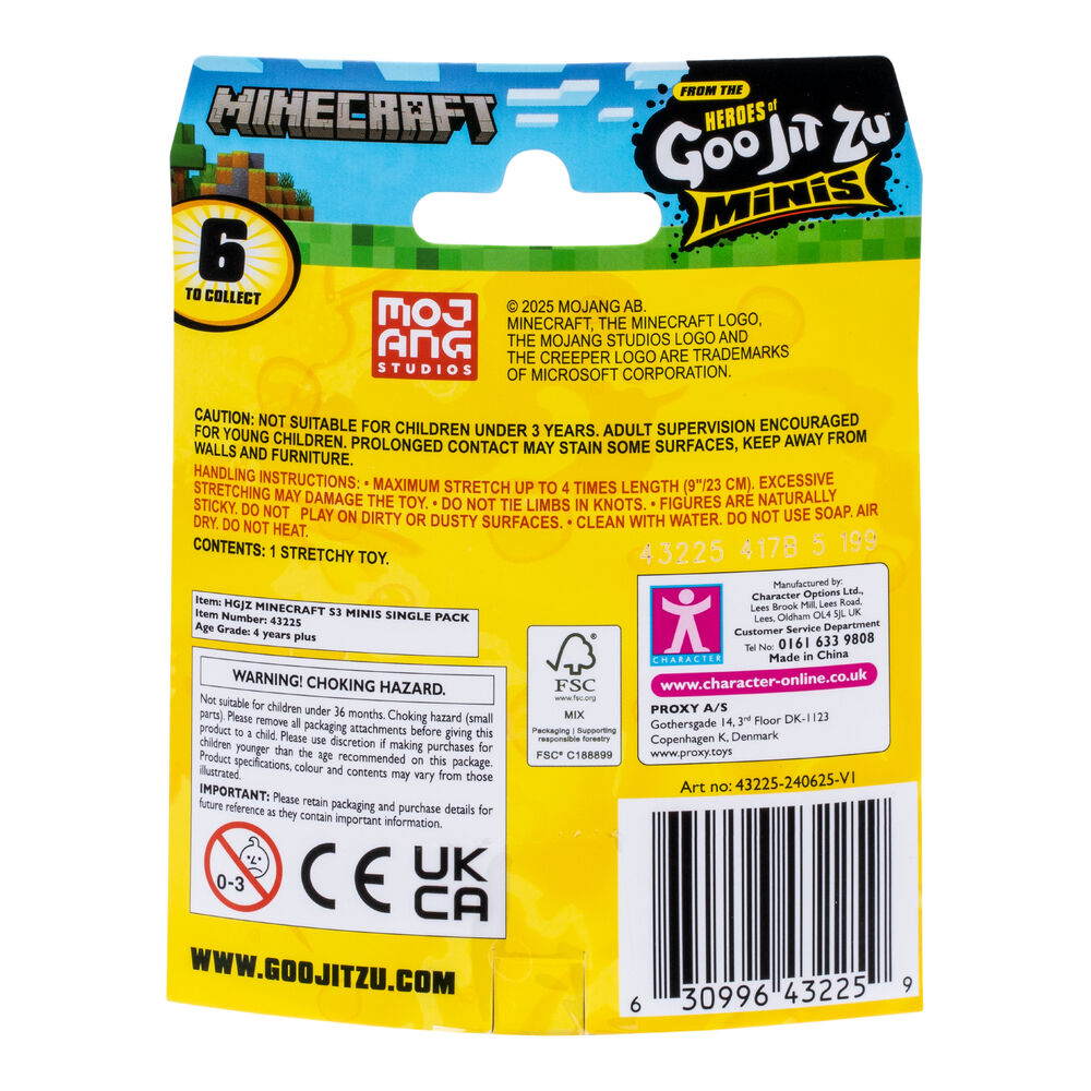 Heroes of Goo Jit Zu Minecraft Minis are here to stretch, squish and battle with! Small in size at just 2.5 inches / 6.35 cm tall but big in stretch and squish, all these Minecraft figures are ready for some stretchy action. Each Mini Minecraft figure can stretch their amazing bodies up to 4 times their actual size. Stretch and wrap them around each other to watch them battle as they go back to their original shape and size. There are six Super Stretchy Mini Figures to collect. Many of your favorite Minecraft characters are available in this Mini Goo Jit Zu range including Steve, Alex, Diamond Steve, Enderman, Skeleton, and Creeper!