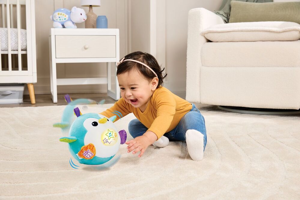 Promotes crawling, reaching, and gross motor skill development through movement.