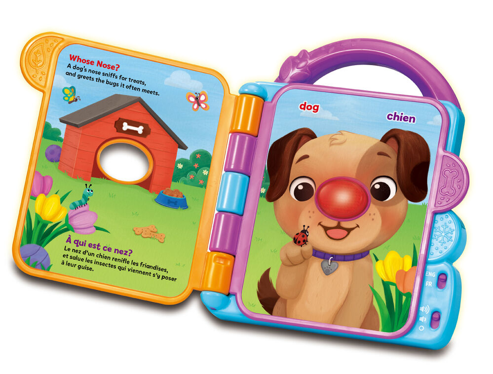 Discover a world of learning and fun with friendly animal friends on every page! Little ones will love pressing the light up nose to hear engaging animal sounds, cheerful sing-along songs, and playful story narration. Each page turn activates interactive responses that spark curiosity and keep young minds engaged. With bright, colourful illustrations and fully bilingual content in English & French, this book is perfect for supporting early language development. The age-appropriate text encourages vocabulary building, listening skills, and comprehension in both languages. Designed to entertain and educate, it's a joyful way for children to learn through play, every time they turn the page!