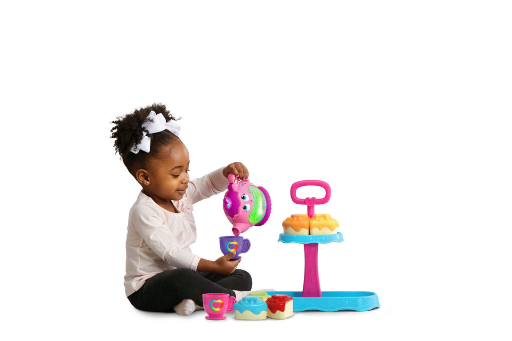 - Includes everything for a pretend tea party for two! Fill and empty the tea pot, pretend to have cake and listen to playful music.