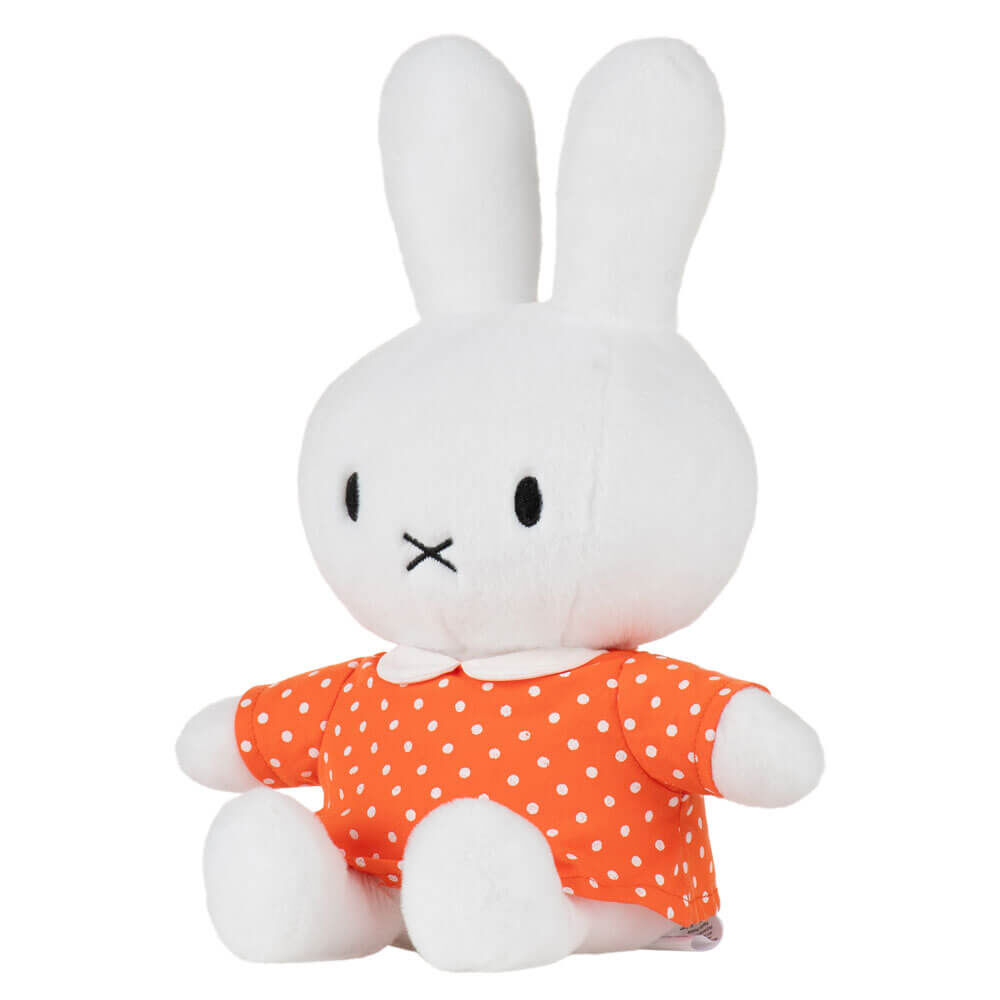 Bold and fun, this 29cm Miffy plush wears an eye-catching orange dress dotted with playful white spots. Her familiar crisscross mouth and gentle expression are lovingly embroidered, and her velvety-soft plush makes her a comforting cuddle buddy. Miffy’s dangly feet add a touch of whimsy and movement, making her even more endearing during playtime or to pose. A bright, modern take on a beloved classic.